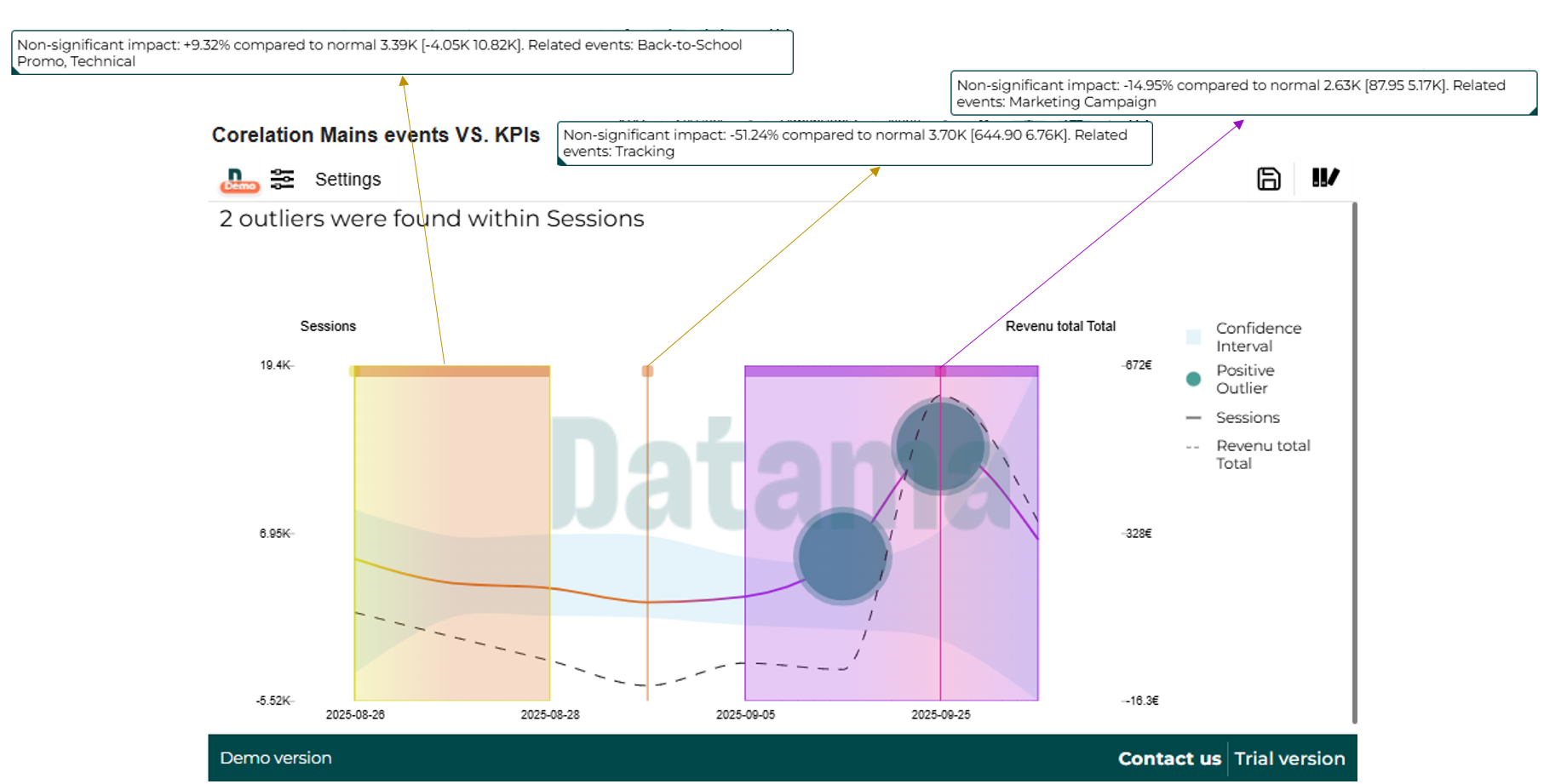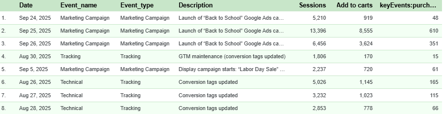 The final showcase would be like below, highlighting how different business or operational events may have positively or negatively influenced your KPI trends. For example, in this case, we’re tracking traffic variations for an e-commerce platform and overlaying the events calendar to reveal correlations between company activities and traffic performance.