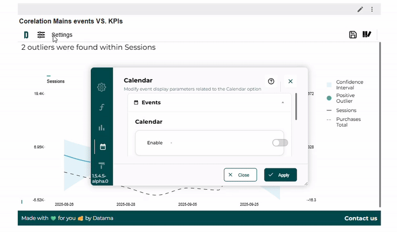 Once connected, you can join your KPI table if it isn’t already included in your calendar table (see [here] for how to prepare a dataset in Datama Prep), and then display it in Datama Detect to start analyzing the correlations between your events and KPIs.