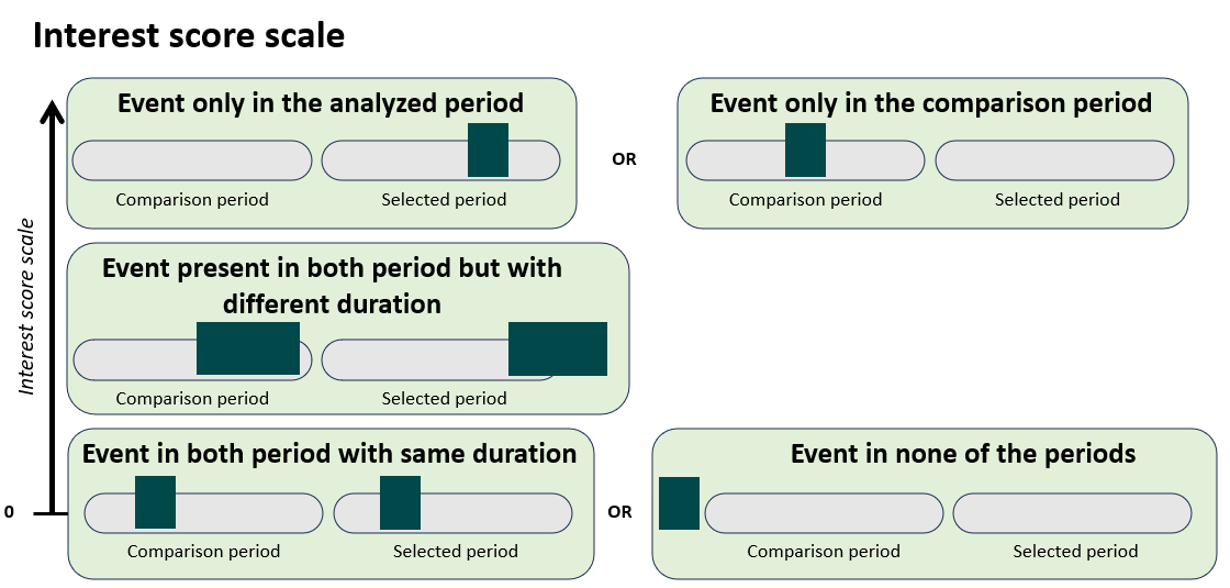 The interest score measures how relevant an event is when comparing two periods. It is mainly calculated on how the event overlaps between the comparison period and the selected (analyzed) period. And the key principle is the less similar an event is across the two periods, the higher its interest score will be.