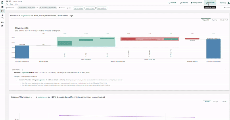 - Slides: Each slide is coming with title + graph + comment (except alert wich is just a message). Bridge is representing the detail on the step with the main variation.