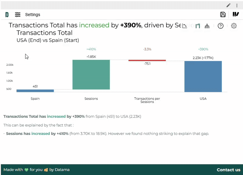 Add a second comparison to display a side‑by‑side waterfall focused on another scope. For example, while comparing USA vs. UK, you can also add a Mobile vs. Tablet comparison within the “Device” dimension.