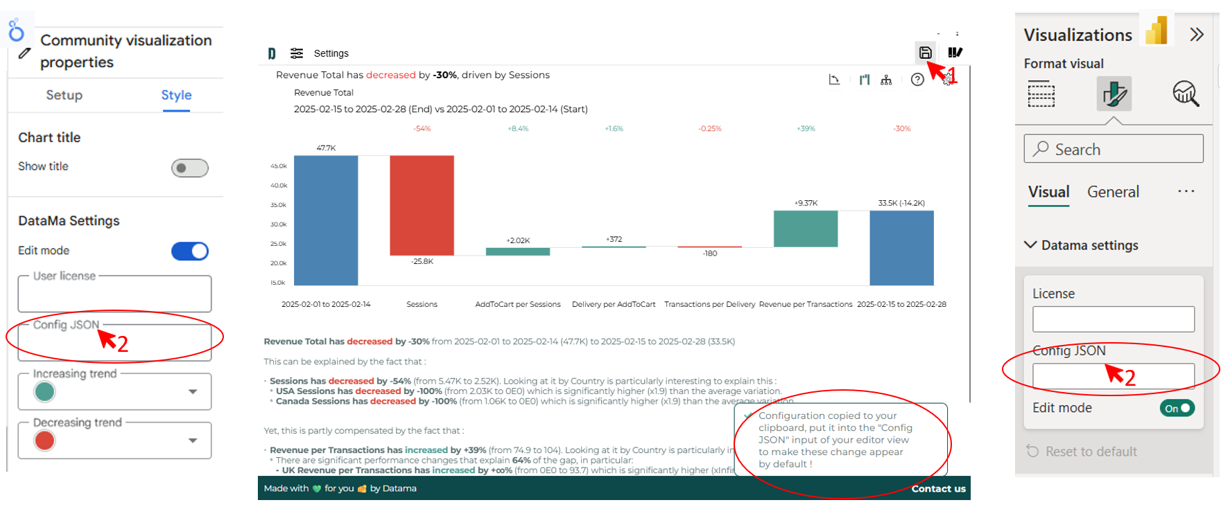 For premium users on Looker Studio and Power BI: once you customize your chart, click the Save button at the top right, then paste the JSON automatically copied to your clipboard into the Config JSON field in the style panel. Otherwise, your settings will be lost when you refresh the BI report.