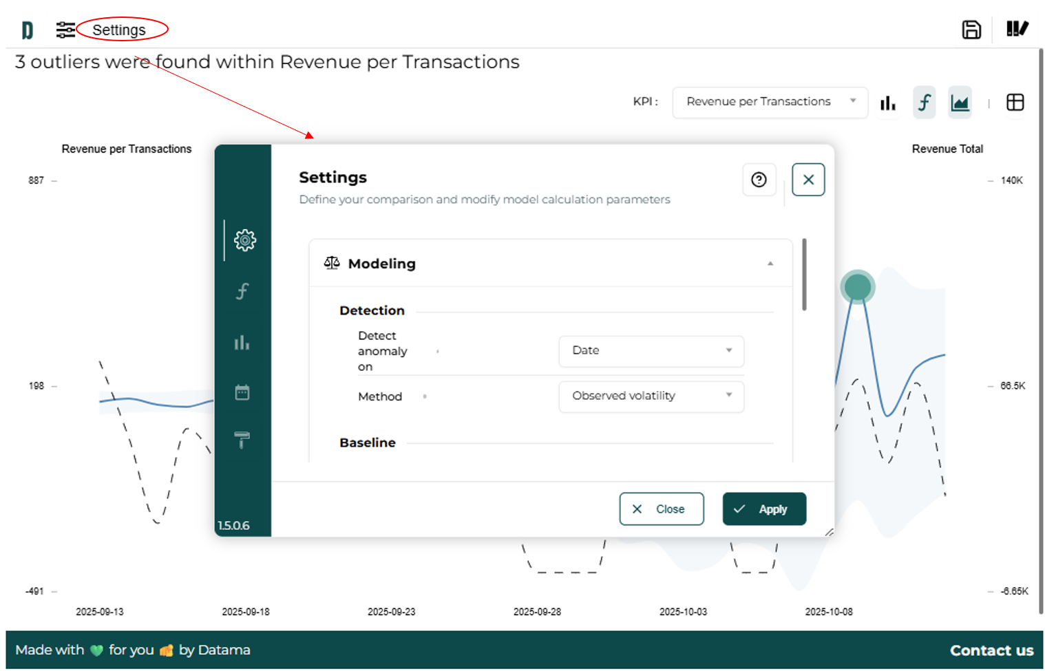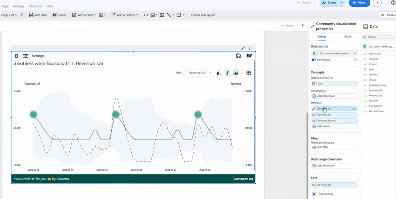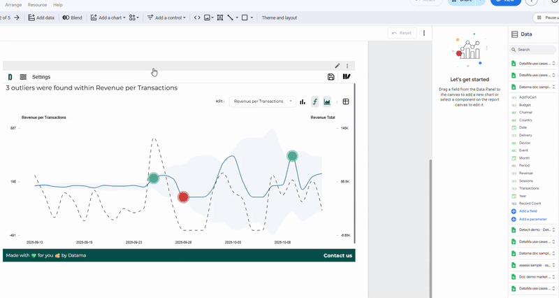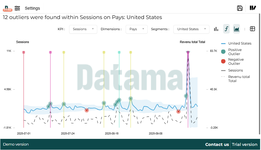 You can now display Calendar Events right in Datama detect trend lines. For now, this works only if you have your events available in your extension dataset, with at least a Date column, and an event label. By activating the Calendar capabilities in the settings, you will be able to see the events or periods annotated on your trend lines. This is particularly useful for storytelling, to explain why a KPI behaves differently. In the medium term, Datama will allow you to create new events directly in the extension, and explain variations or spot anomalies based on these events.