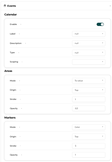 This section allows you to customize the event area — for example, display it at full size or up to a specific value, hide the area, choose whether it starts from the top or bottom, set the stroke size for calendar event areas in pixels, and adjust opacity.