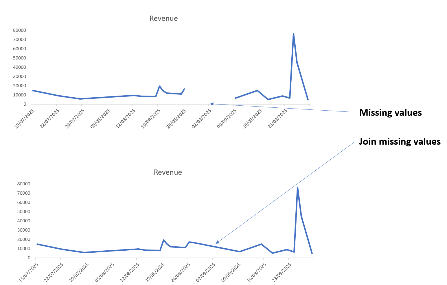 Collapse empty continuous values. When this option is enabled, the chart removes continuous intervals (such as dates or numeric ranges) that have no data, so the remaining values are displayed without gaps. This helps make time series or continuous charts look smoother by connecting only the periods that contain actual data, instead of showing empty spaces for missing values.