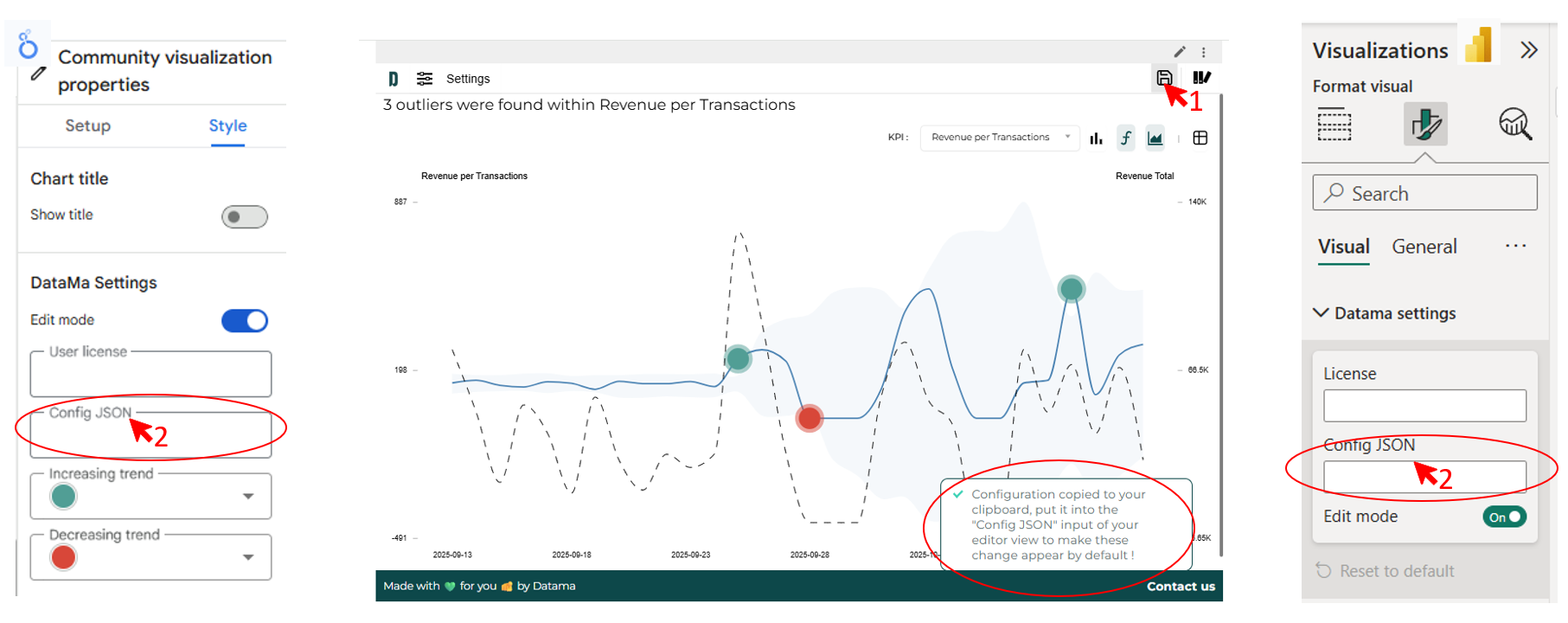 For premium users on Looker Studio and Power BI: once you customize your chart, click the Save button at the top right, then paste the JSON automatically copied to your clipboard into the Config JSON field in the style panel. **Otherwise, your settings will be lost when you refresh the BI report.