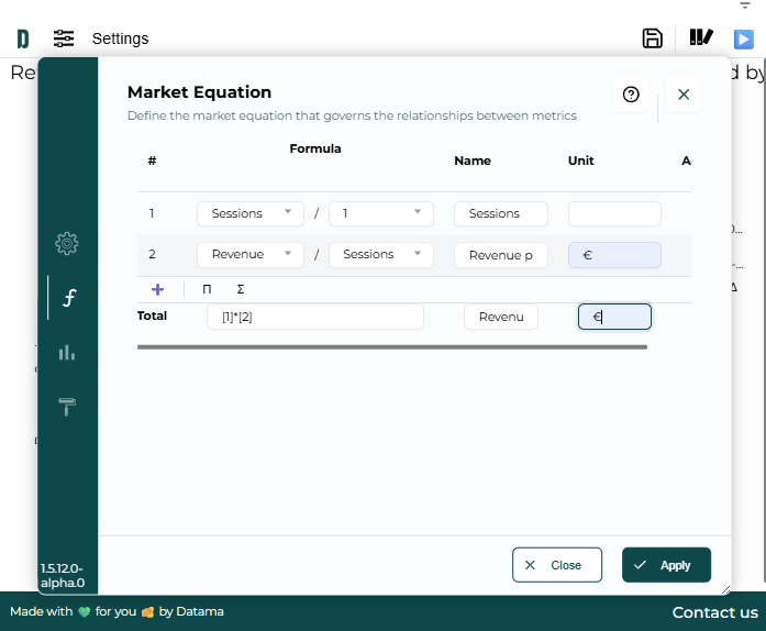 Using metrics relation allows you to change your market equation, add a unit, rename your step or even indicate a threshold, exclude or focus on a dimension. Metric relation describes the equation between metrics of your source, in order to compute the KPI you want to explain.