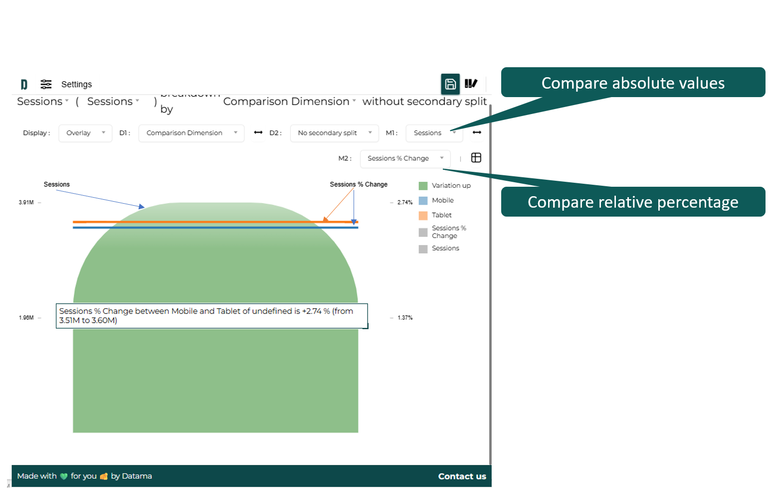 - 4. KPI change in Absolute value or Percentage: For comparisons between segments or between time periods, Datama Explore allows you to show the variations either as absolute differences or as percent changes, depending on the format that best fits your analysis.