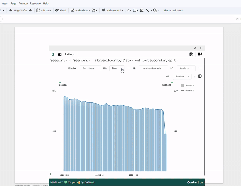 2. Second metric: Datama Explore also supports comparing two KPIs side by side. Simply add a second metric in M2. For example, you can define M1 = Sessions and M2 = ABV to visualize how the two metrics evolve across your chosen dimensions.