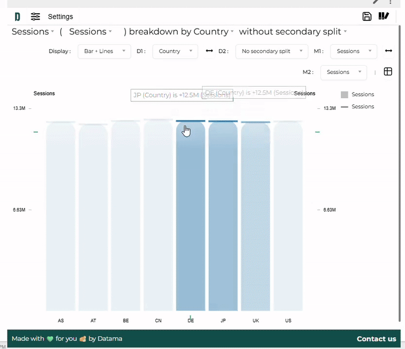 1. Dimension and second breakdown: Datama Explore lets you break down every metric in your dataset across any available dimension. You can also drill down dimension-by-dimension: for instance, start by breaking down product sales by Country in D1. If you want to focus on the UK, you can then introduce a second breakdown dimension in D2—such as Channel, Device, or any other available dimension—to refine the analysis.