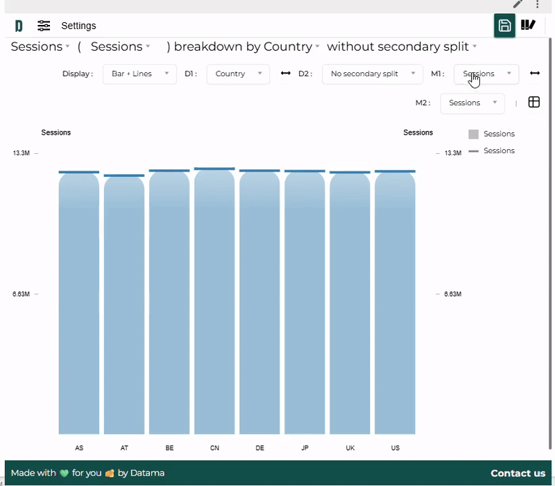 - Second metric: Datama Explore also supports comparing two KPIs side by side. Simply add a second metric in M2. For example, you can define M1 = Sessions and M2 = ABV to visualize how the two metrics evolve across your chosen dimensions.