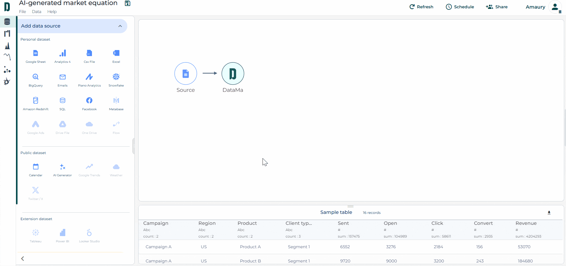 You can now generate a synthetic dataset simply by describing your use case via a prompt. In a matter of seconds, a complete dataset is created… along with the associated market equation This breakthrough is ideal for prototyping and testing ideas 💡 without the need for real data. Simply select the block ✨ in Datama Prep, describe your needs, validate the equation, and then generate your use case 🎯 This saves time for brainstorming and experimenting! 🧪